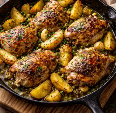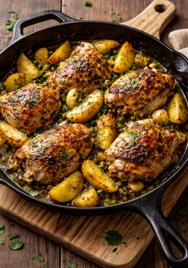 Pour off all but 2 tablespoons of the fat from the skillet, and then return the chicken and potatoes to the skillet. Sprinkle with the parsley and garlic and then pour the wine over all of it. Cover and bake for 10 minutes, and then uncover and bake 15-20 more minutes until the potatoes are fork-tender and thigh juices run clear. The internal temperature of each of the chicken pieces should be 165 degrees. Let it sit for 5 minutes before serving and then serve with the pan juices.