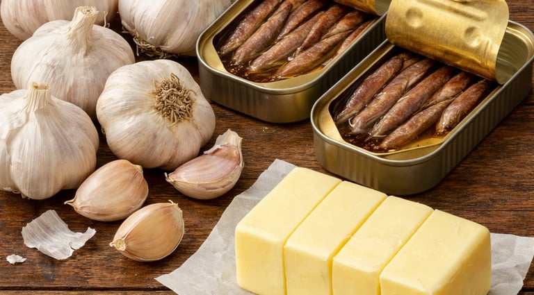 What you're going to do is melt the butter - all of the butter - over medium low heat and then add all of the garlic. Saute it carefully and do not let the garlic brown. Then reduce the heat to low and add the drained anchovies and cook until the anchovies have fallen apart and disintegrated.