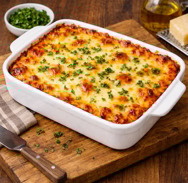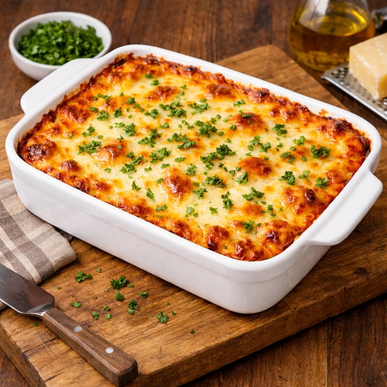 Bake for 30-45 minutes until hot, bubbly, and the edges have just started to turn brown. Remove from the oven, cover with foil or the dish's lid, and allow it to sit for 10-15 minutes before cutting. Serve with a green salad and fresh Italian bread.